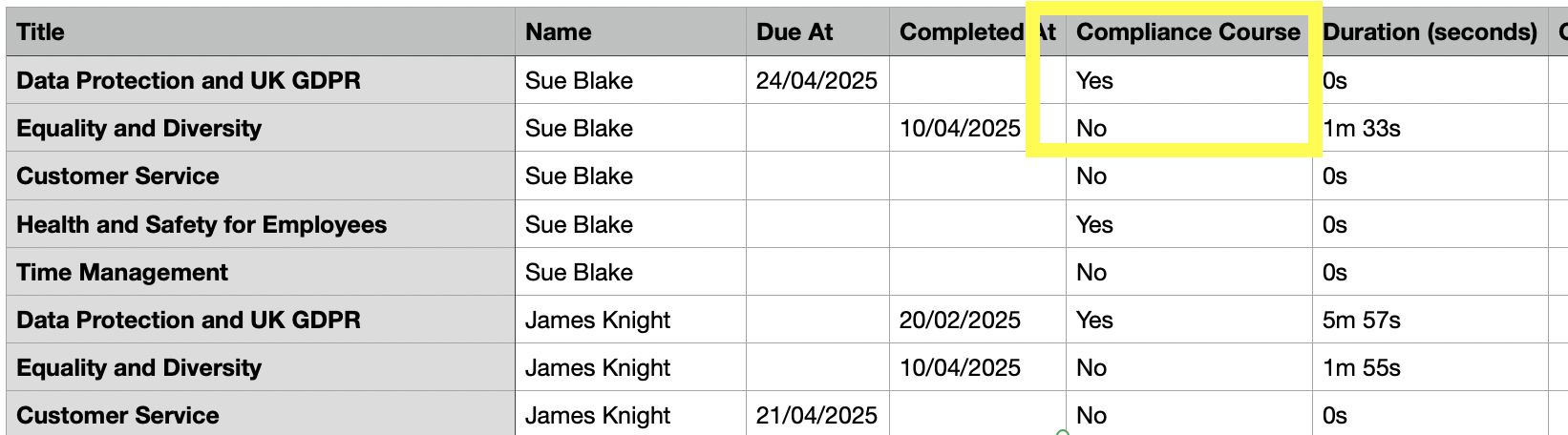 Toggle 'on' or 'off' the compliance course status on your courses, and this status will show in your downloadable reports.