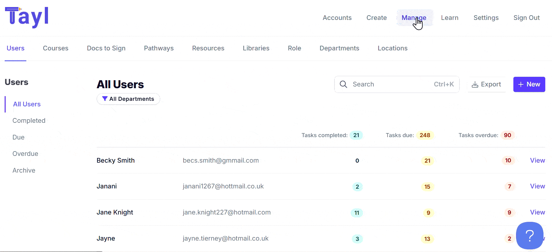 - Go to the Users section in the Manage tab and click view on their name to enter their profile.